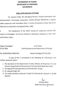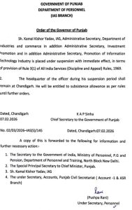 सरकारी आदेशों के अनुसार, उद्योग, निवेश प्रोत्साहन और सूचना प्रौद्योगिकी प्रोत्साहन विभाग के प्रशासनिक सचिव कमल किशोर यादव और जसप्रीत सिंह, जो पंजाब इन्फोटेक के प्रबंध निदेशक थे, को तत्काल प्रभाव से निलंबित किया गया है। निलंबन की अवधि के दौरान दोनों अधिकारियों को चंडीगढ़ स्थित राज्य मुख्यालय में रिपोर्ट करने के निर्देश दिए गए हैं।